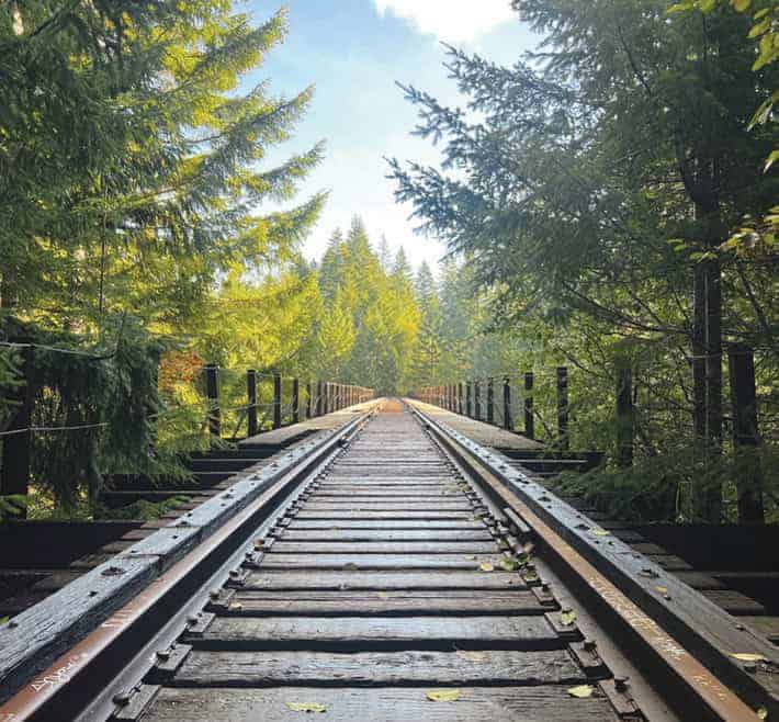 Through forest draped in thick fog, rust-orange rails guide me forward, narrowing to a point 20 meters ahead. I hike on an abandoned railroad, first laid in 1911 by Japanese, Irish, Swede, Austrian, Greek, Russian, Bulgarian and Norwegian immigrants, now a ghost in a filigree frame of overgrowth. Between the ties, diverse mushroom species grow.